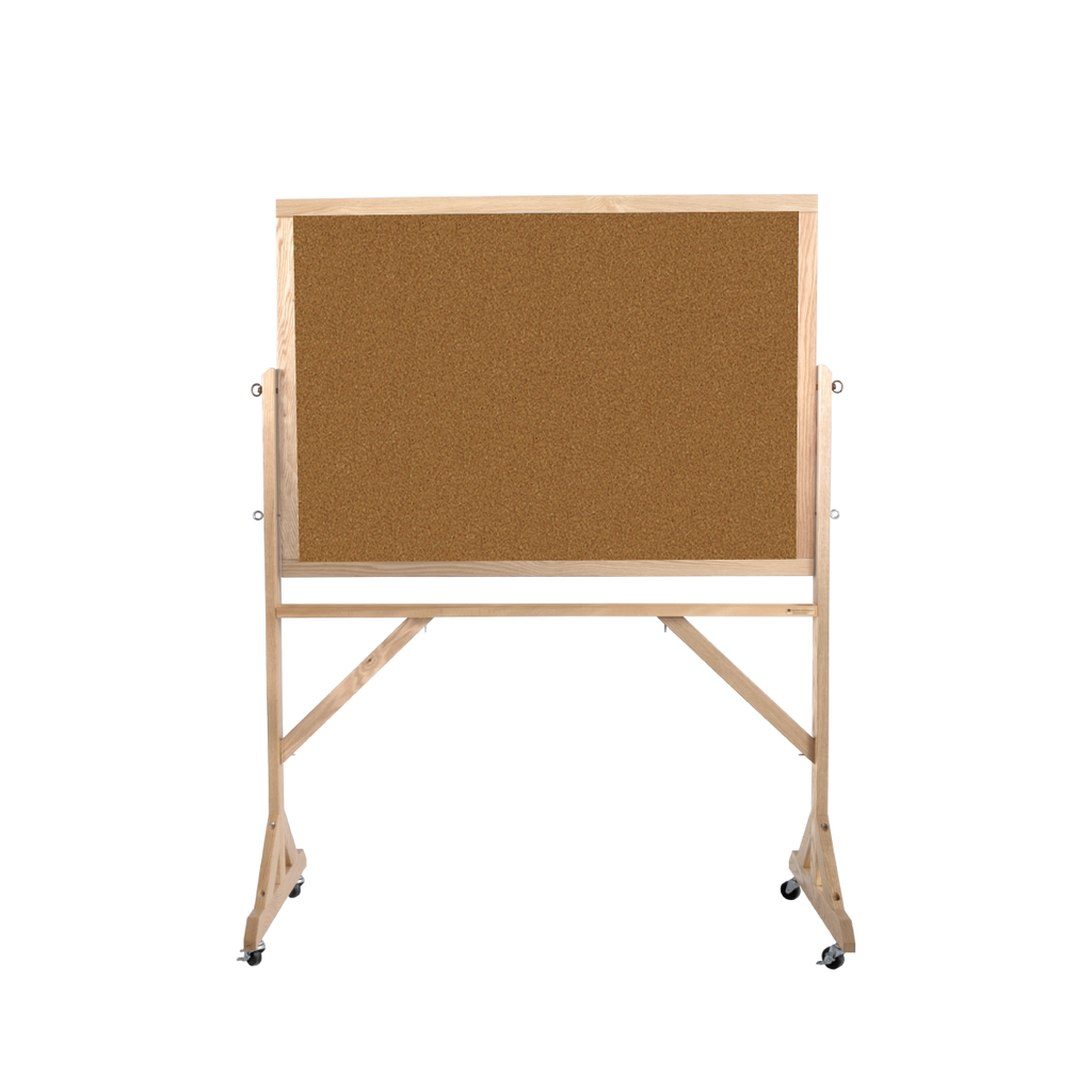 Natural Oak Framed Natural Cork Portable Revolving Bulletin Board with Locking Casters. Great for mobile presentations and posting notices in temporary spaces. Used in the film industry, Netflix Series, and TV Shows.